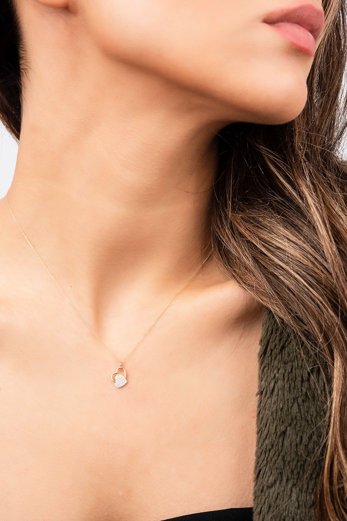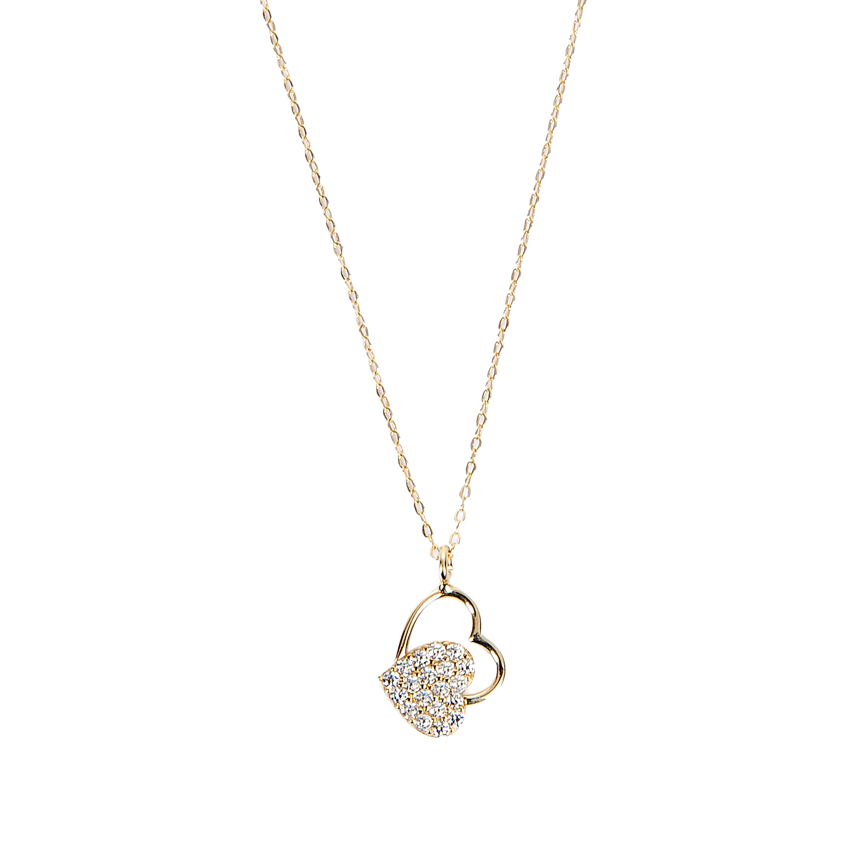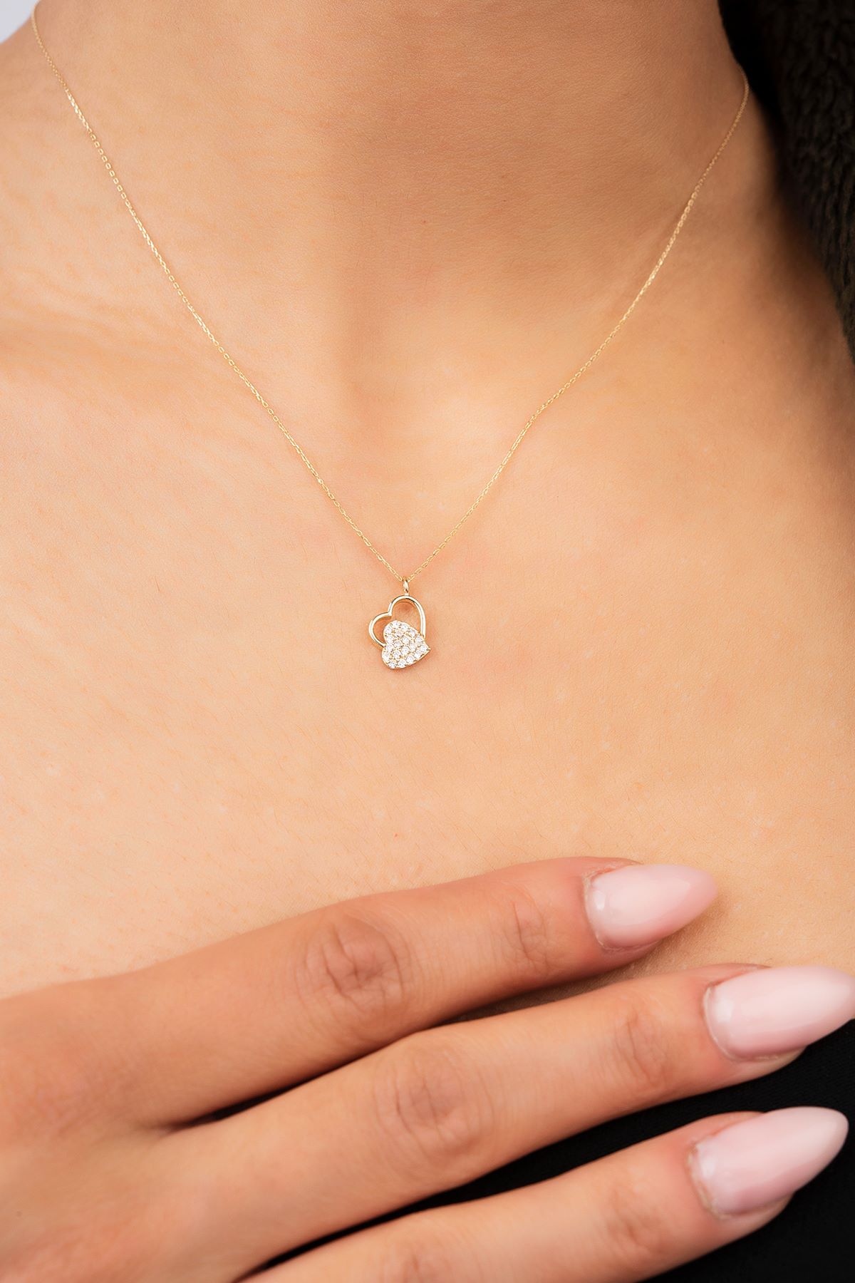 Taşlı Çift Kalpli Hayalet Altın Kolye 8KLY640